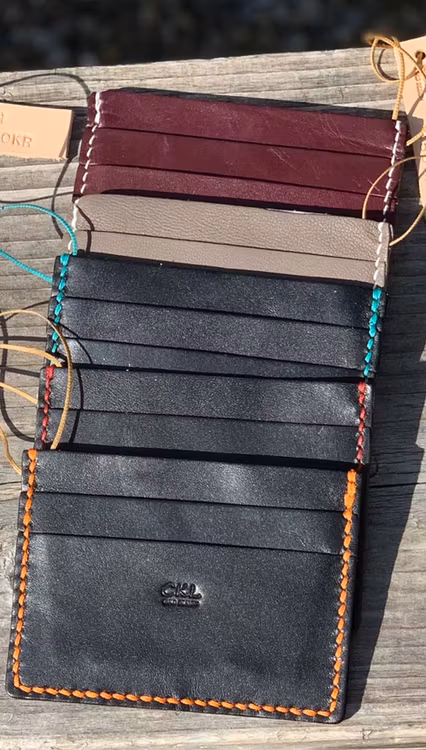 Korthållare Alex i skinn med kortfack på båda sidorna och ett fack i mitten. En liten korthållare på cirka 10*7cm. Välj skinn och färg på söm svart, orange, röd ljusbeige/vit. Har ni egna önskemål kan ni skriva det i meddelande så försöker vi i mån av material tillmötesgå er och vi återkopplar innan tillverkning så ni vet om det blir det ni valt i webbshoppen eller enligt ert eget önskemål.